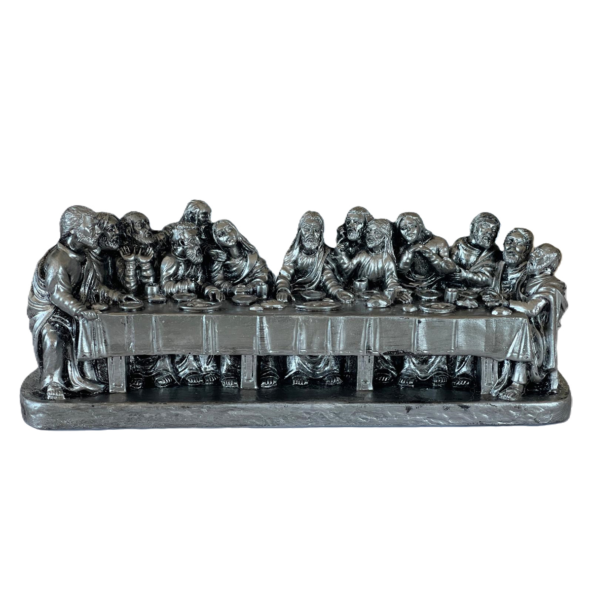 Figurina Cina cea de Taina la 21.5×7 cm cu finisaj argintiu satinat are un aspect mai mat si mai nuantat decat argintul lucios, cu o patina subtila mai apropiata de metalul autentic. Cina cea de Taina este asociata cu masa comuna si cu unitatea familiei in jurul mesei, una dintre cele mai recunoscute scene din iconografia crestina.