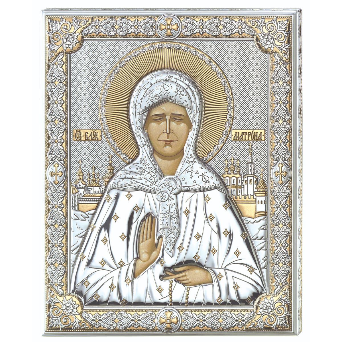 Icoana Sfantei Matrona din argint la 16×20 cm cu accente aurii este varianta mai formala din serie. Contrastul dintre aurul aureolei si argintul mat al fondului este clar vizibil si apreciat de aproape. Sfanta Matrona este cunoscuta pentru darul vindecarii bolnavilor, al clarviziunii si al consolarii celor in suferinta. Este o icoana pentru casa aleasa de persoanele care o cinstesc in mod special.