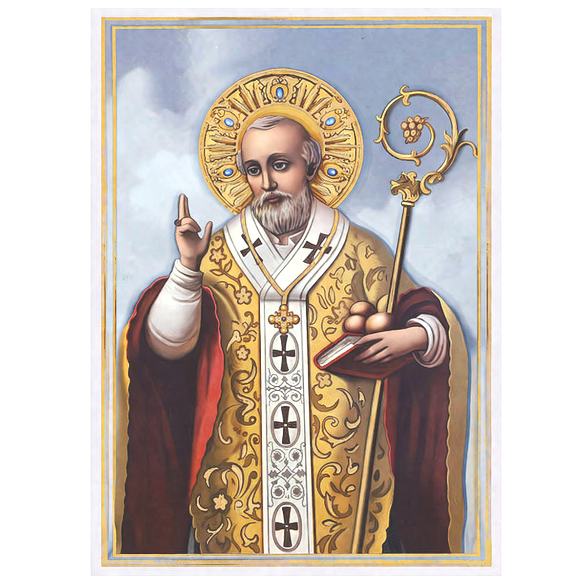 Icoana Sfantul Nicolae cu foita de aur il prezinta in tinuta episcopala completa: vesmant auriu bogat, toiagul cu varf decorat, gestul de binecuvantare si aureola ornamentata.
